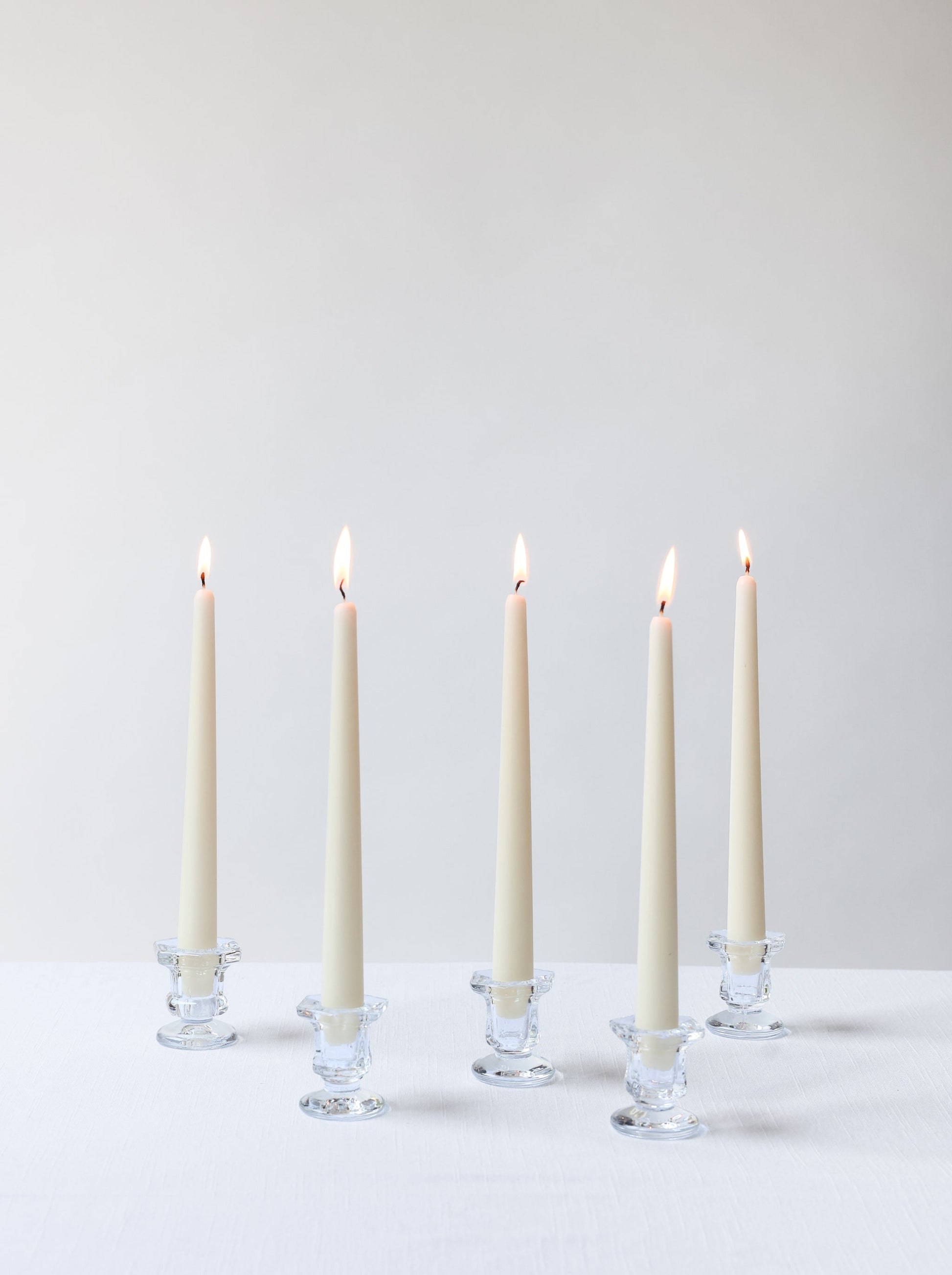 Ideal to add atmosphere to your table arrangements, a clear glass holder with an ivory candle, with a burn time of approximately 8 hours. Mix and match with the tealight candle option to create candlelight at different levels.