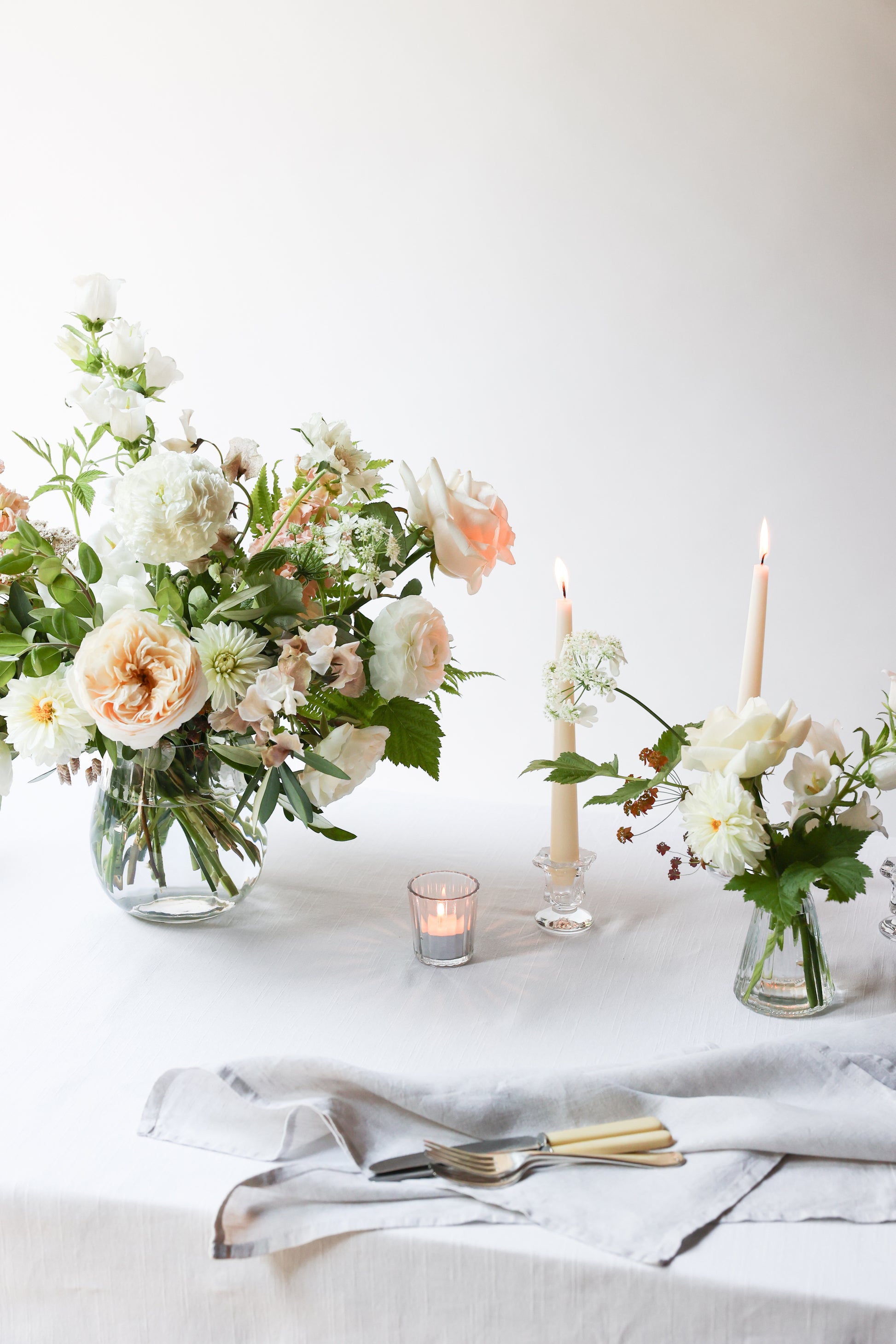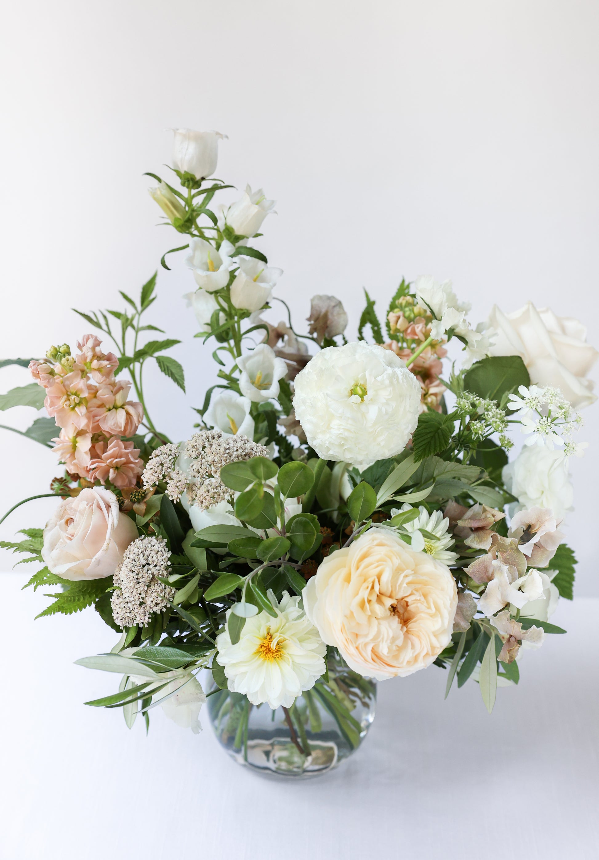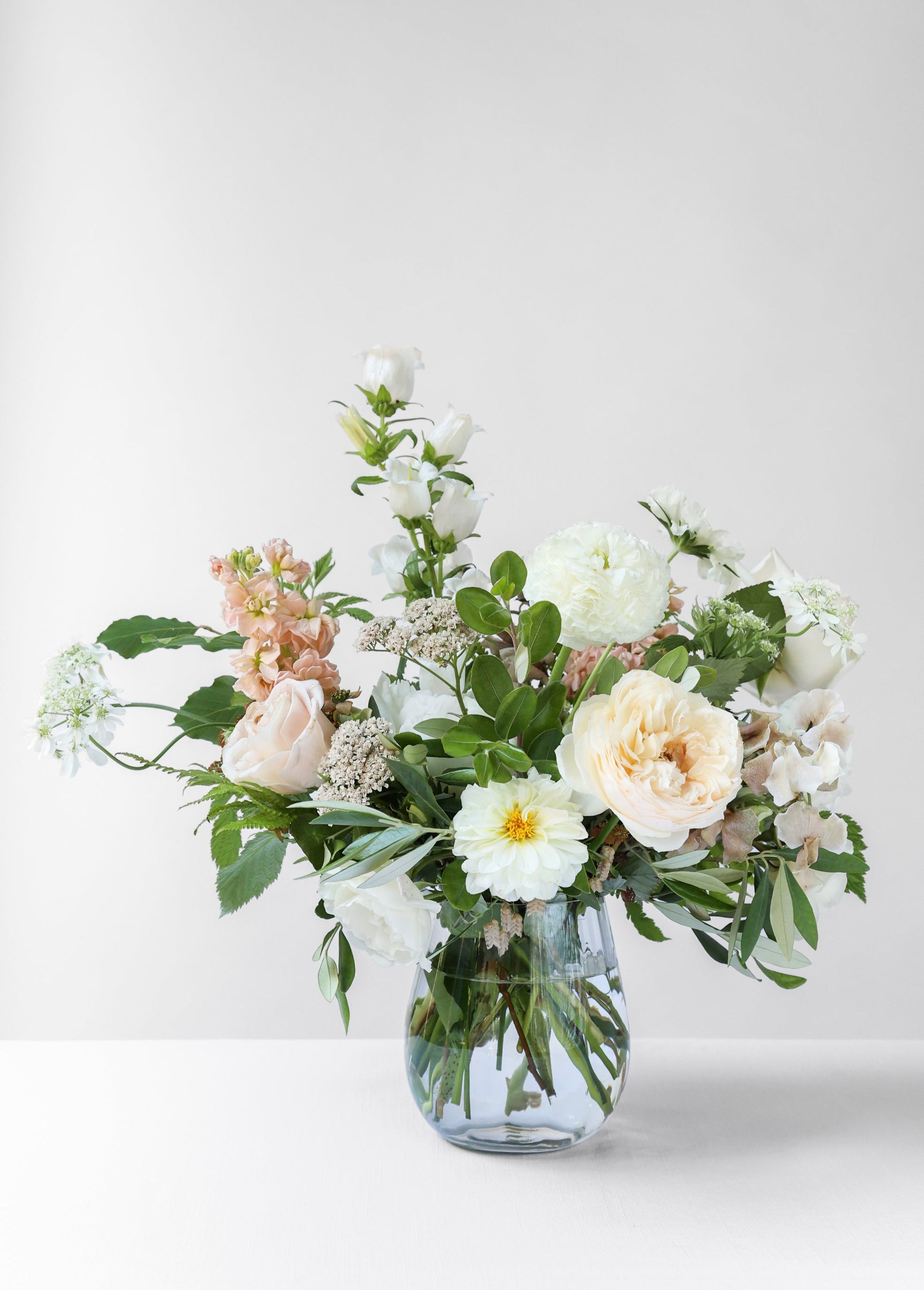 A gorgeous selection of flowers and foliage arranged in a glass vase in our signature natural, fluid style.