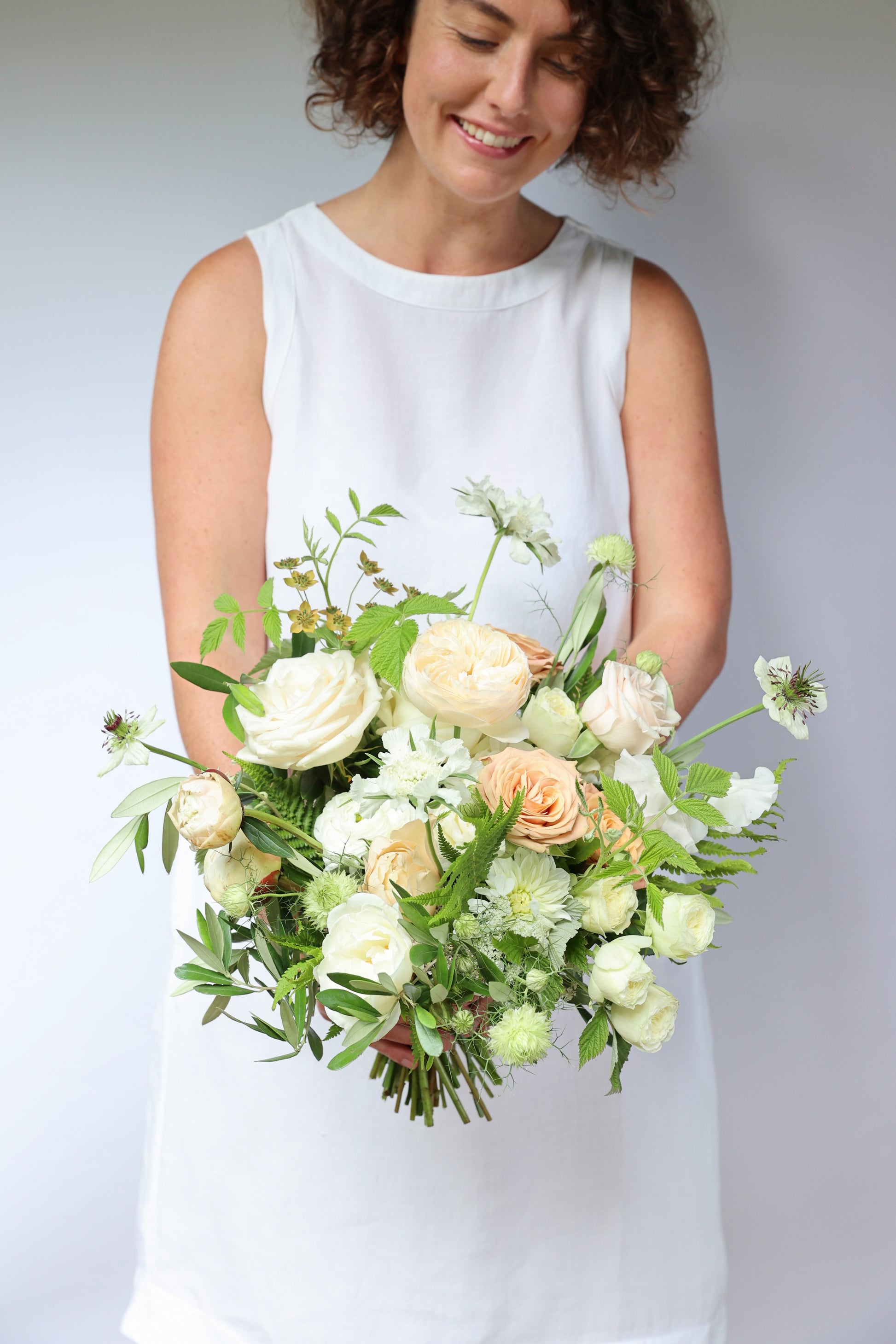 Created in our relaxed, natural style with a more trailing fluid outline, bound simply with a neutral toned satin ribbon.